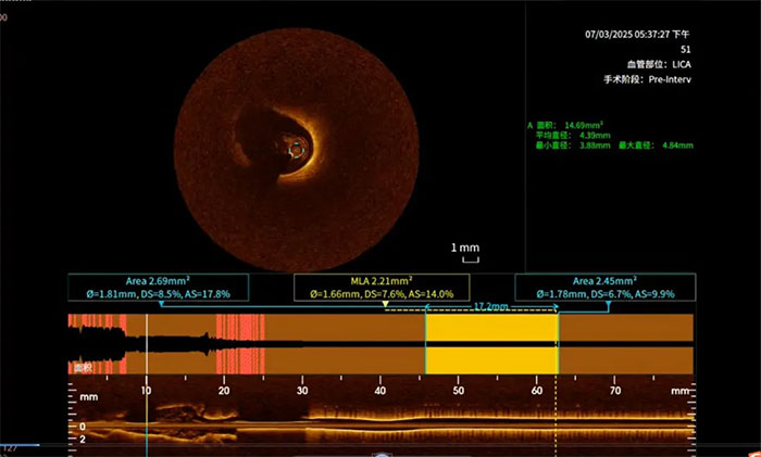 “它像在血管里装了一台显微镜,连斑块里的胆固醇结晶、微小裂痕都看得一清二楚。”席刚明教授介绍,OCT被称为光学相干断层成像技术,是一种具有超高分辨率(可达10微米级,接近头发丝直径)的血管腔内成像技术。它利用近红外光对血管壁进行断层扫描,能够无创地获取血管横断面的高清微观图像,为手术方案的制定提供更为精准的依据。
