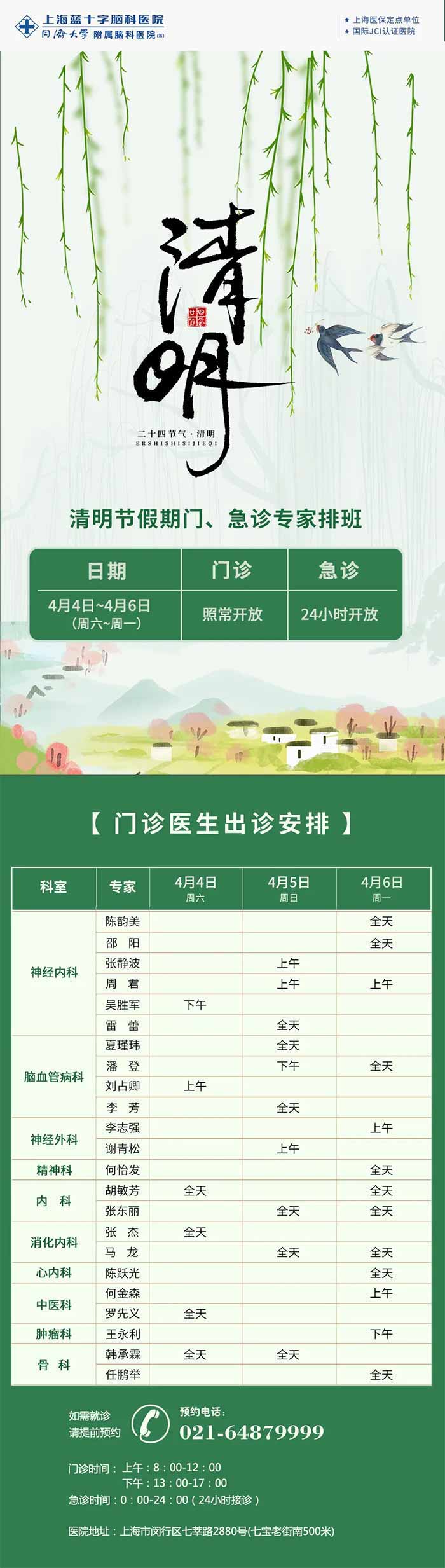 根据国务院发布的节假日安排通知精神,结合医院具体情况,上海蓝十字脑科医院【同济大学附属脑科医院(筹)】清明节假期间(4月4日-4月6日)门、急诊照常开放,具体安排如下,敬请提前安排好工作生活,有序就诊!