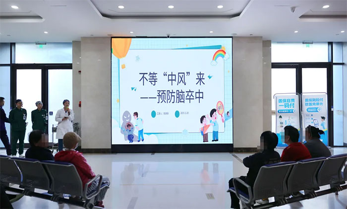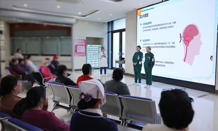 活动中,护士长陈婷婷以沉稳专业的风格串联全场,引导话题层层深入。护士胡珂和叶佳意则创新采用对话问答的形式,将复杂的医学知识变得通俗易懂,为患者和家属生动讲解了卒中的定义、风险因素、科学饮食及运动方案等相关知识,阐释了血管健康是预防卒中的核心,详细介绍科学的饮食方案与运动建议,明晰吸烟、饮酒对血管及血压的巨大危害,更强调了通过科学综合管理,打好“定期体检、遵医嘱用药、健康生活方式”这一套“卒中防御组合拳”的重要性。